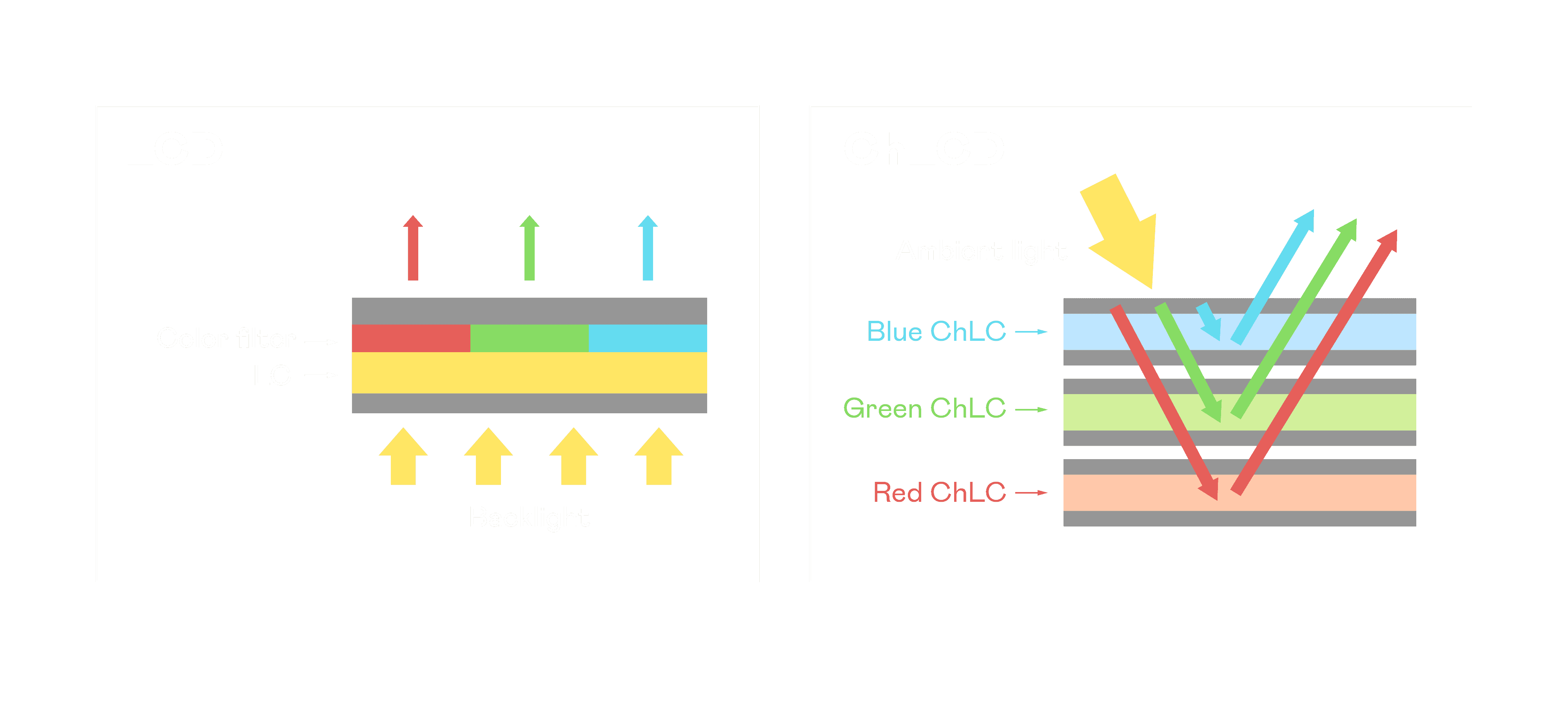 ChLCD 胆固醇液晶就如同纸张一样,,,,透过反射环境光来显示影像,,因此长时间观看不易造成人眼视觉疲劳,,可达到护眼效果。。。。当处于户外阳光下使用,,,,LCD 影像容易失真而不易观看,,但胆固醇液晶仍可维持较佳的影像品质。。
