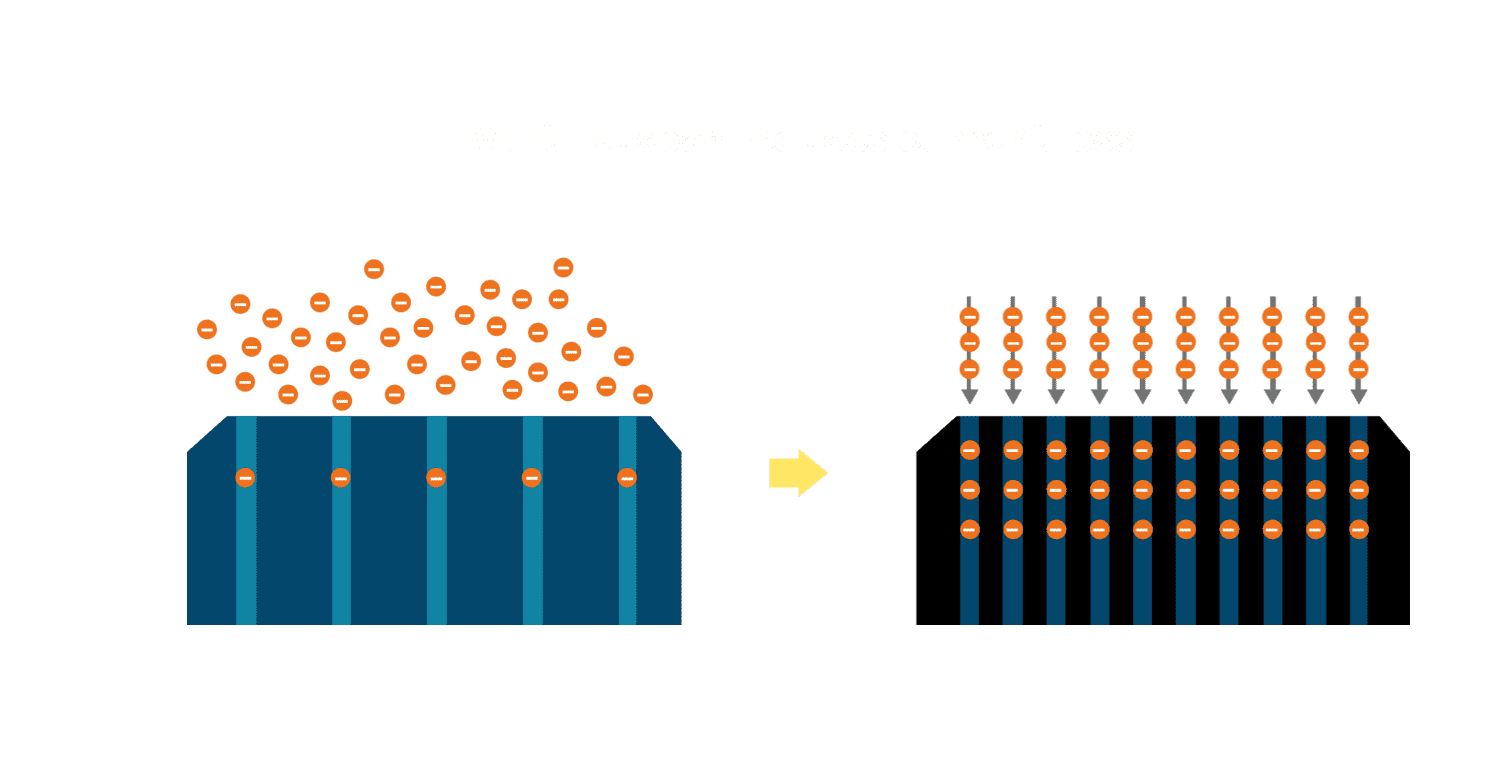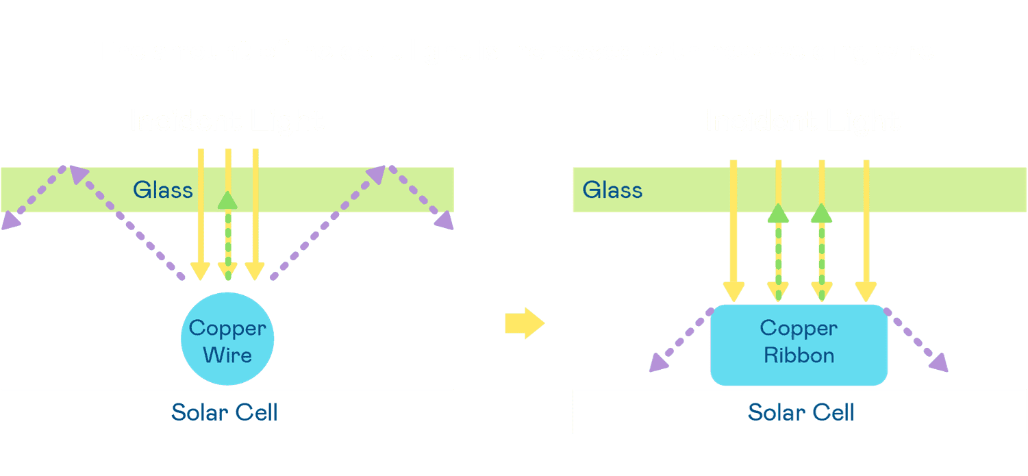 • 电池使用多条铜导线 (Copper wire) 于电池片上形成较短的电流路径,,,提高电流收集效率,,,,采用圆形设计的铜导线较传统扁平式的铜焊带 (Ribbon),,,,可增加入射至电池的光线量。。。