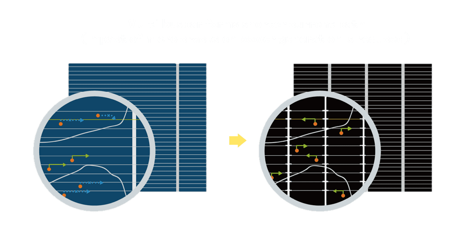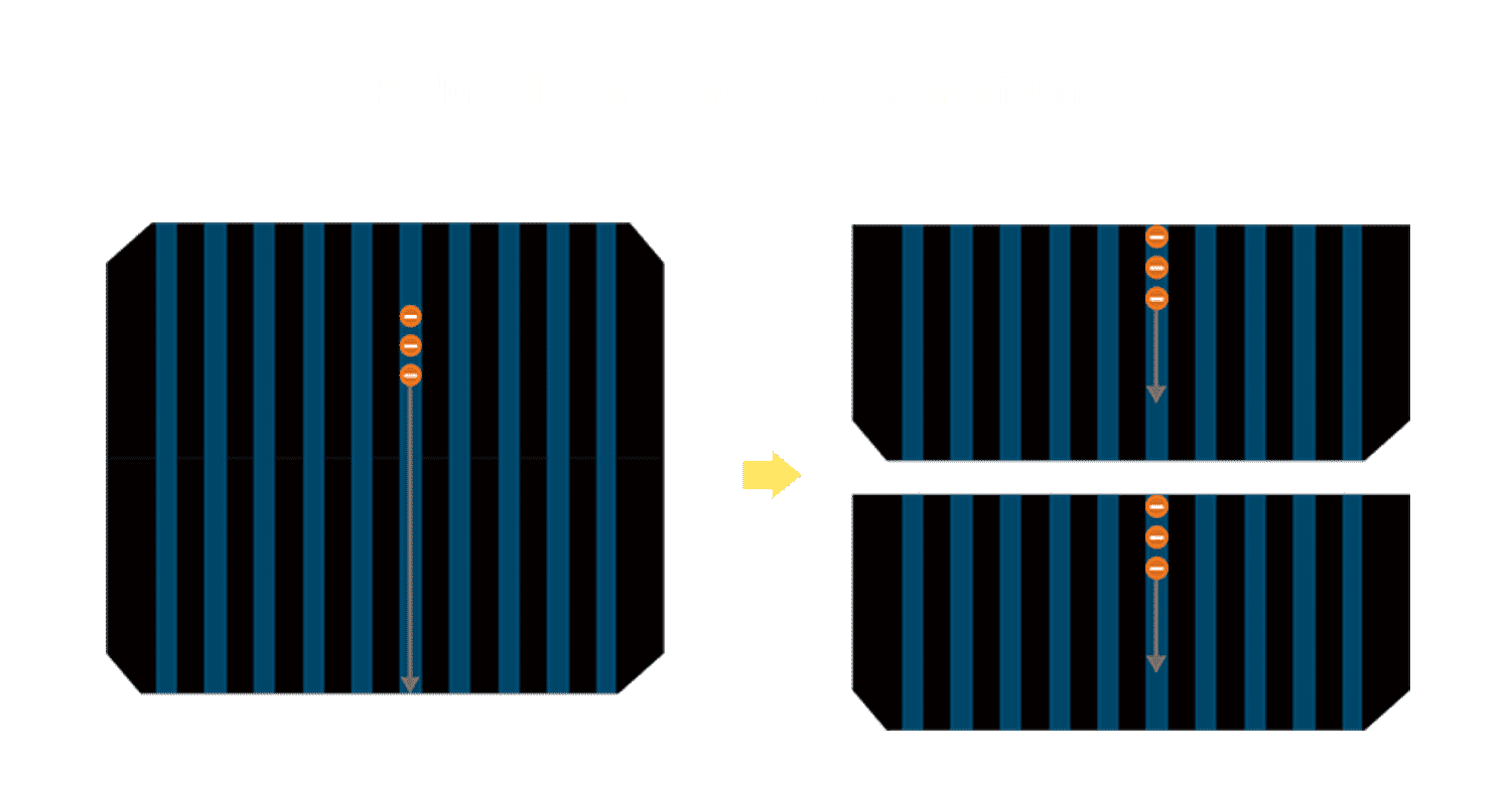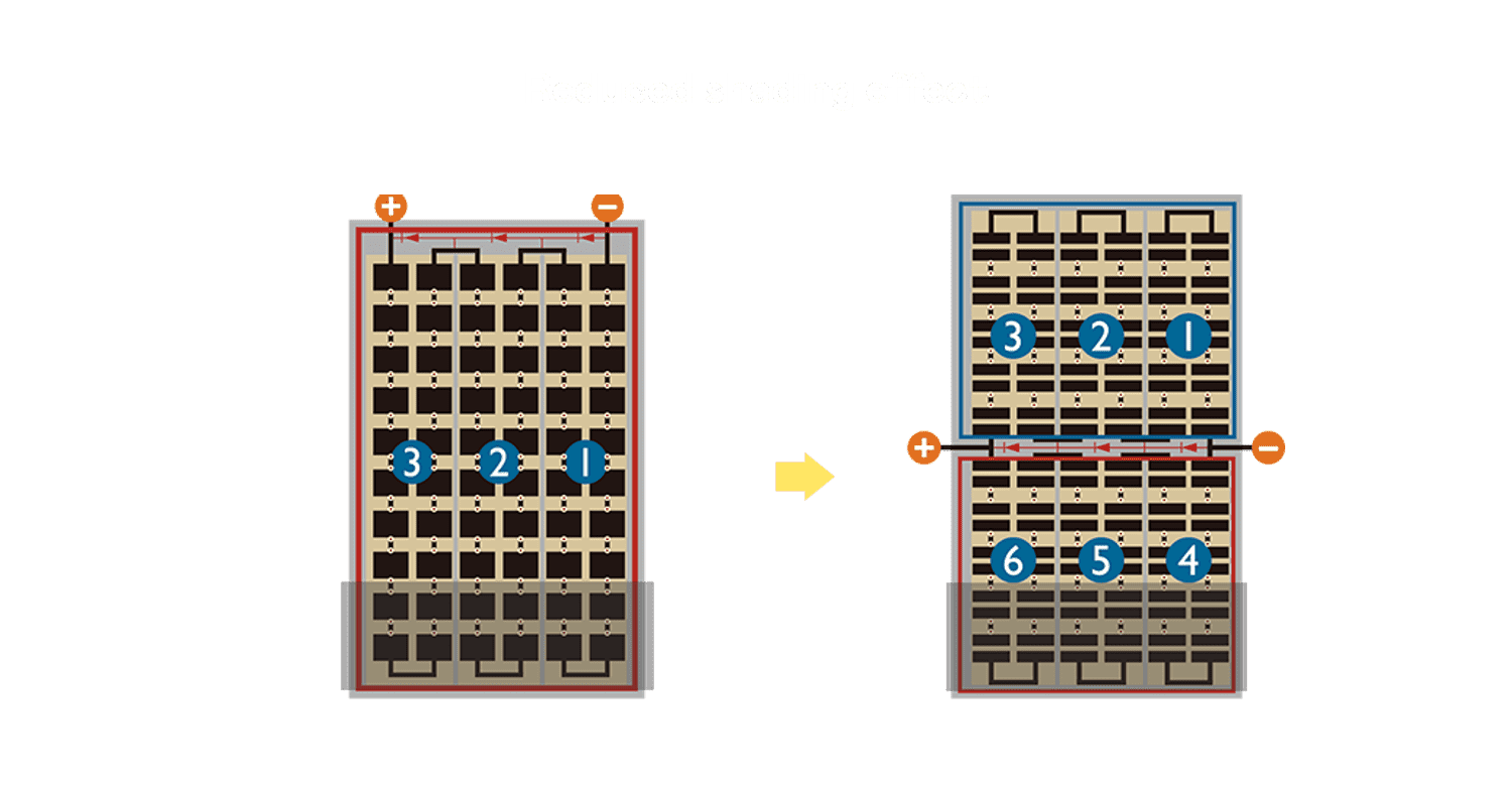 • 结合半切电池,,,,降低遮阴影响、、提升模组抗隐裂能力、、、并减少电阻损耗,,,进一步提升模组发电效能。。。。