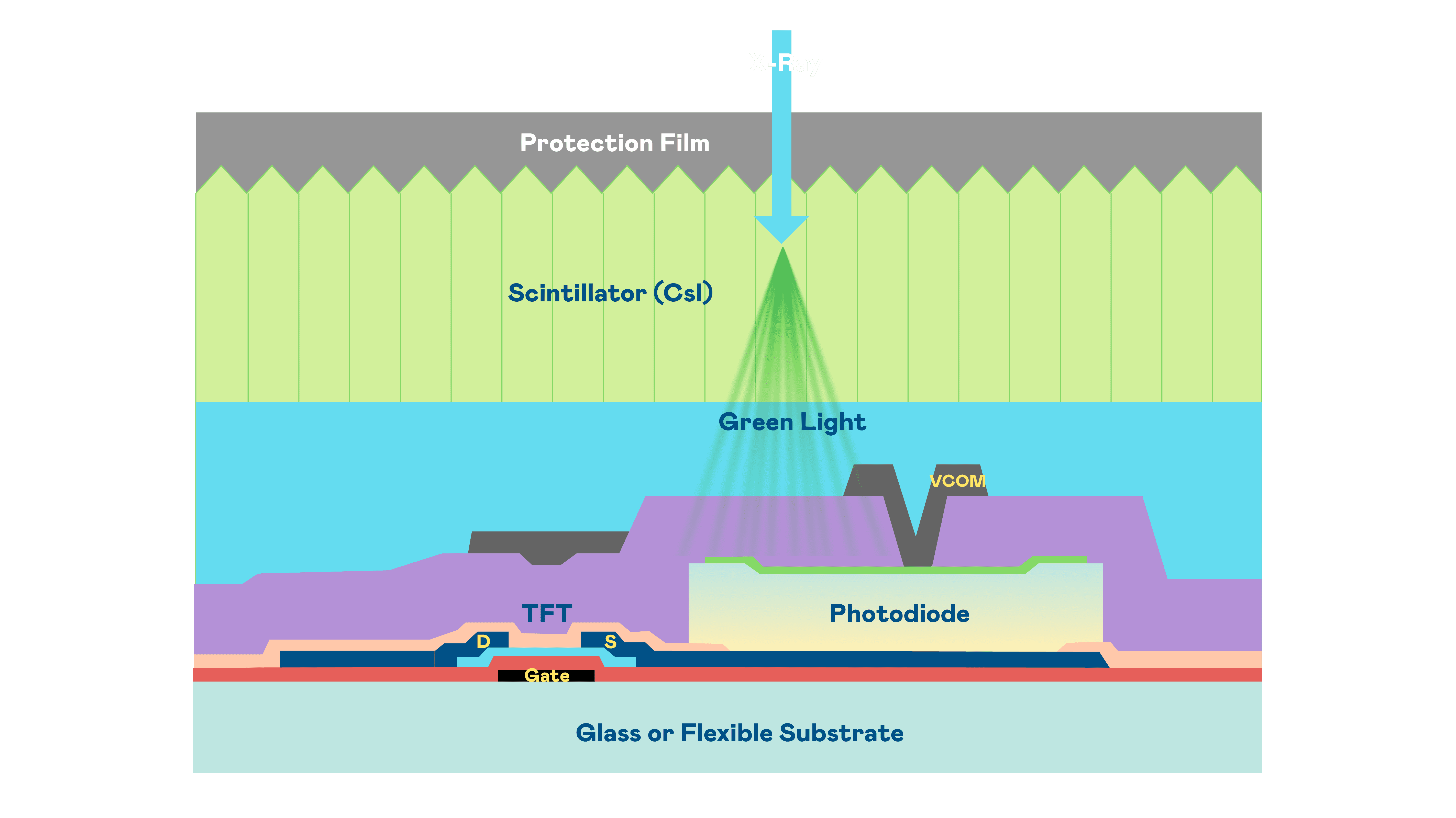 YAXIN111的X光影像感测阵列使用薄膜电晶体 (TFT) 作为每个像素的读取开关,,搭配光电二极体(Photodiode)的光电转换元件,,,用以感测X光影像讯号。。